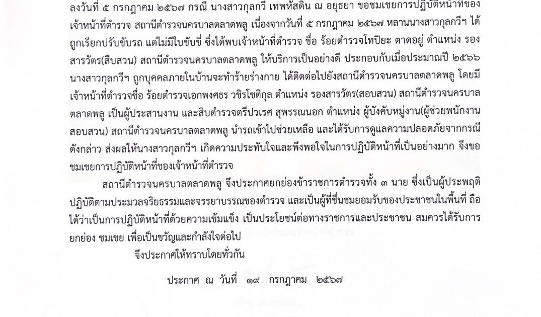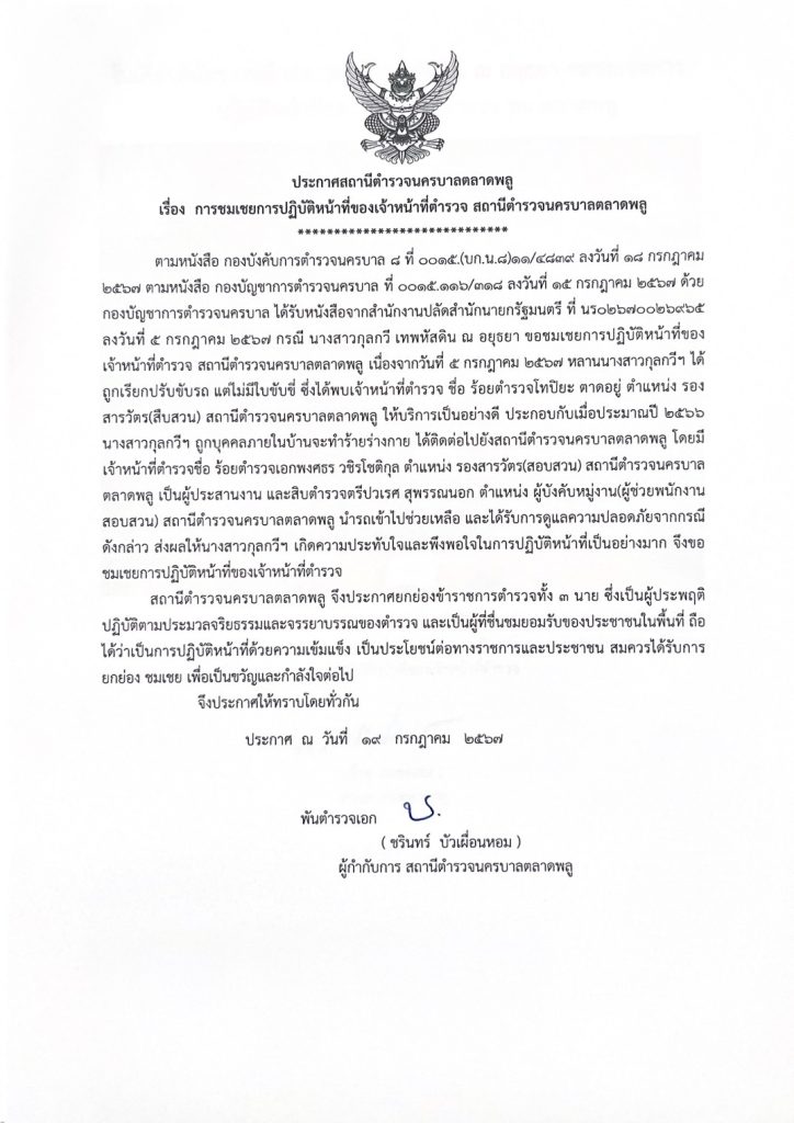 ประกาศการยกย่องการปฏิบัติหน้าที่ของเจ้าหน้าที่ตำรวจ สถานีตำรวจนครบาลตลาดพลู