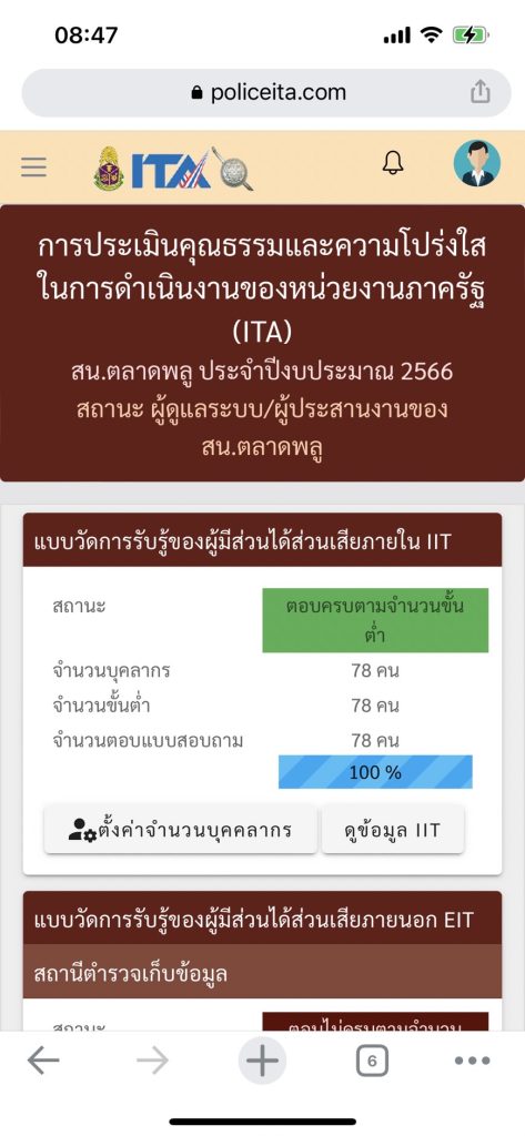ภายใต้การอำนวยการของ พ.ต.อ.ธนา มะลิงาม ผกก.สน.ตลาดพลู มอบหมายให้ พ.ต.ท.เตือน สอดส่อง รอง ผกก.ป ,พ.ต.ท.ฐิติวัฒน์ บุญภา สว.อก. เป็นผู้ควบคุม กำกับดูแลการประเมินคุณธรรมและความโปร่งใสในการดำเนินงานของหน่วยงานของภาครัฐ (ITA) 2566 ซึ่งผลแบบการรับรู้ของผู้มีส่วนได้เสียภายใน (IIT) ของ สน.ตลาดพลู ครบ 78 นาย 100% เรียบร้อย