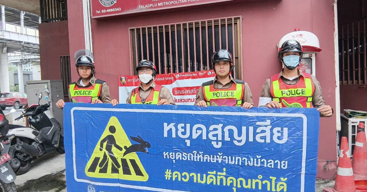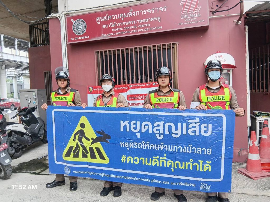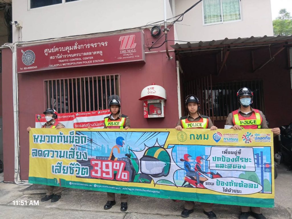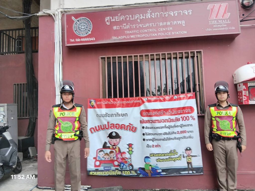 (12 พ.ย.68) เจ้าหน้าที่ตำรวจราจร พร้อมนักเรียนนายสิบ (นสต.) ฝึกหัดปฏิบัติราชการ ร่วมประชาสัมพันธ์โครงการพื้นที่สวมหมวกนิรภัย 100 % บริเวณแยกรัชดาตลาดพลู แขวงตลาดพลู เขตธนบุรี กรุงเทพมหานคร