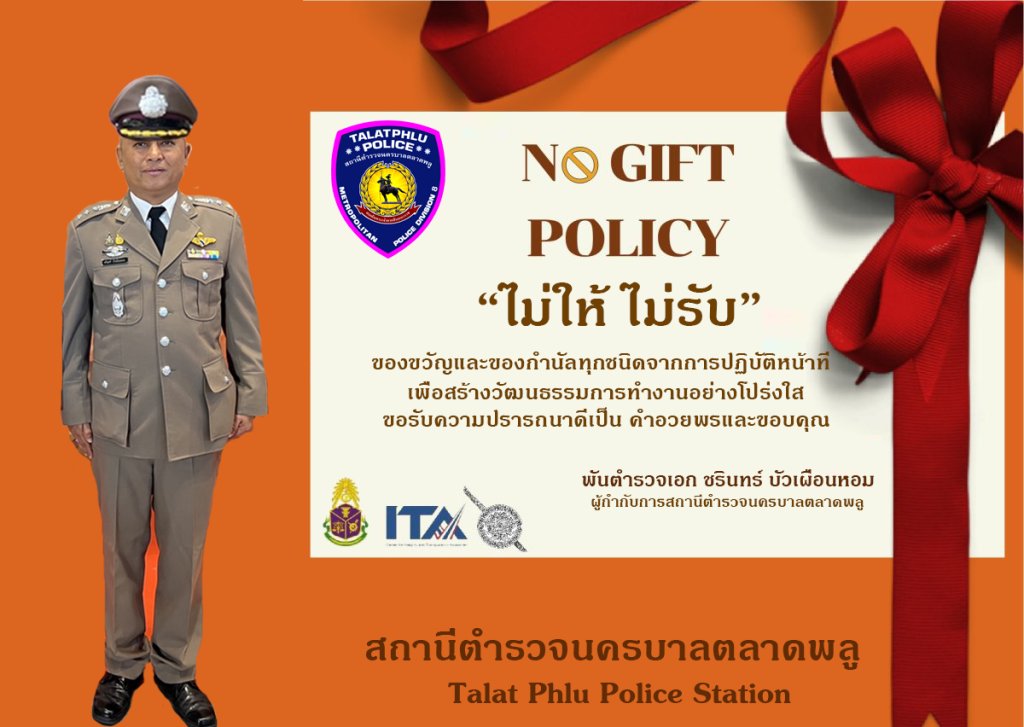 เมื่อวันที่ 10 ม.ค.67 เวลา 10.00 น. พ.ต.อ.ชรินทร์ บัวเผื่อนหอม ผกก.สน.ตลาดพลู ได้ประกาศเจตนารมณ์ “ไม่ให้ ไม่รับ” NO GIFT POLICY ของขวัญและของกำนัลทุกชนิดจากการปฏิบัติหน้าที่ เพื่อจะได้สร้างวัฒนธรรมการทำงานอย่างโปร่งใส