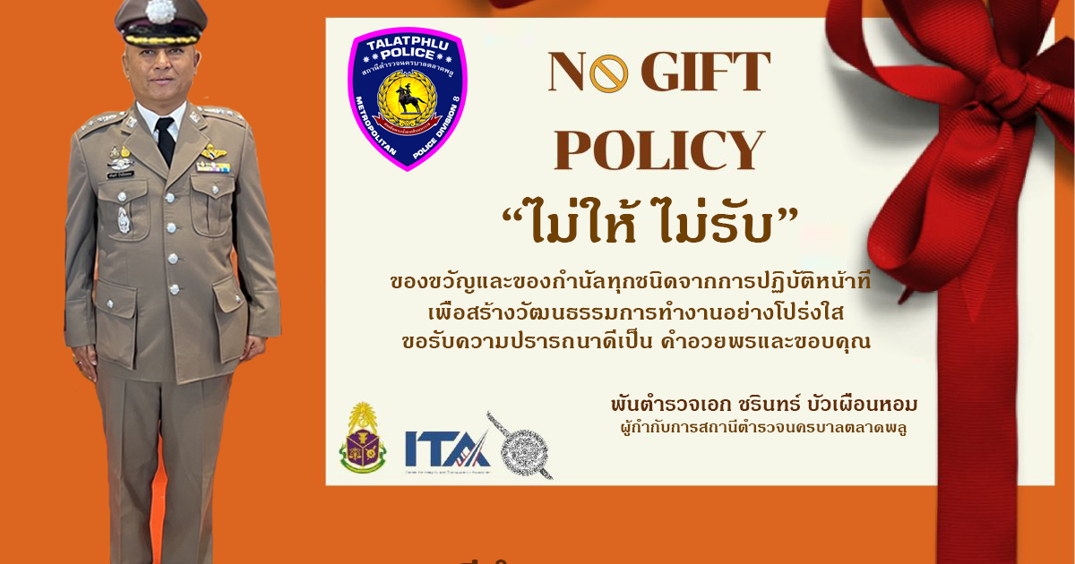 เมื่อวันที่ 10 ม.ค.67 เวลา 10.00 น. พ.ต.อ.ชรินทร์ บัวเผื่อนหอม ผกก.สน.ตลาดพลู ได้ประกาศเจตนารมณ์ “ไม่ให้ ไม่รับ” NO GIFT POLICY ของขวัญและของกำนัลทุกชนิดจากการปฏิบัติหน้าที่ เพื่อจะได้สร้างวัฒนธรรมการทำงานอย่างโปร่งใส