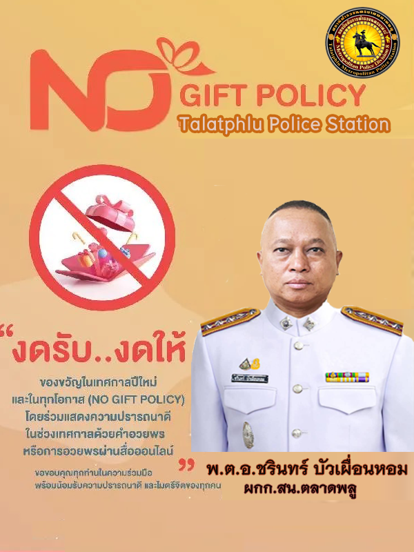เมื่อวันที่ 1 กุมภาพันธ์ 2566 พ.ต.อ.ชรินทร์ บัวเผื่อนหอม ผกก.สน.ตลาดพลู ได้ประกาศเจตนารมณ์ NO GIFT P