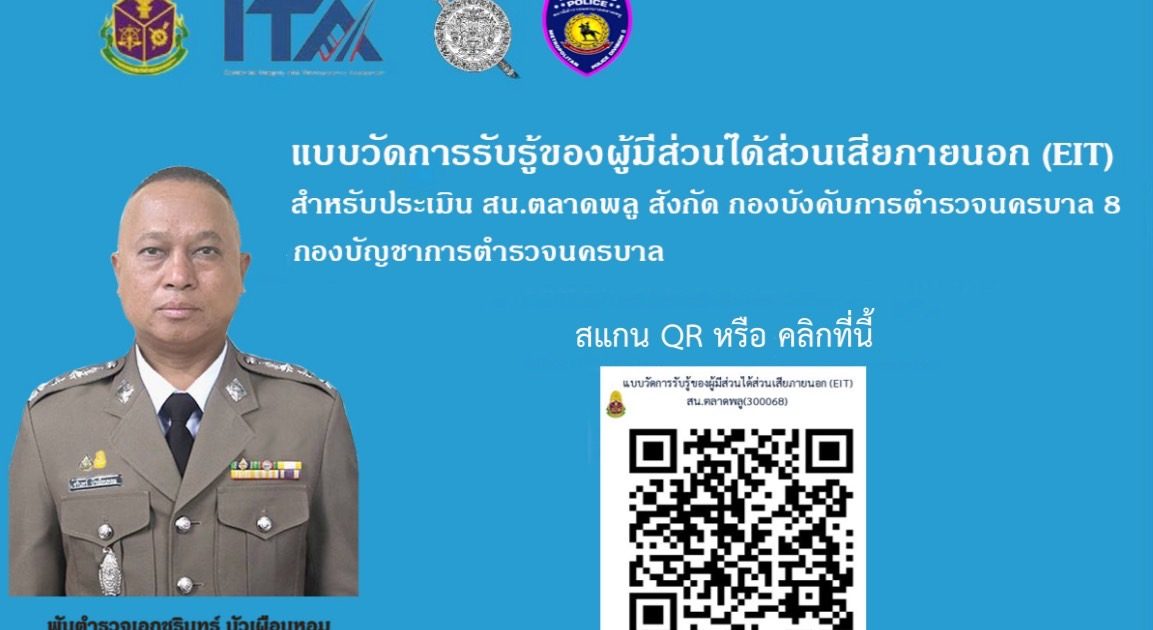 (9 ม.ค.67) สถานีตำรวจนครบาลตลาดพลู เชิญชวนผู้มาติดต่อราชการ ร่วมตอบแบบวัดการรับรู้ของผู้มีส่วนได้ส่วนเสียภายนอก (EIT) 2024 เพื่อนำไปปรับปรุงการให้บริการต่อไป